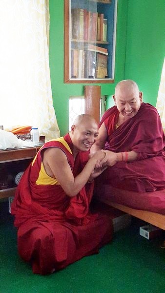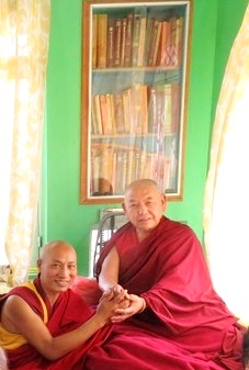 với Sư Phụ của Ngài là Thầy Jetsun Thupten Rinchen và chư tăng của tu viện Mật Tông Gyumed trước chánh điện của tu viện