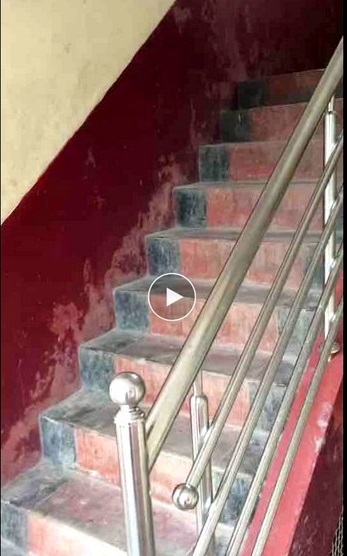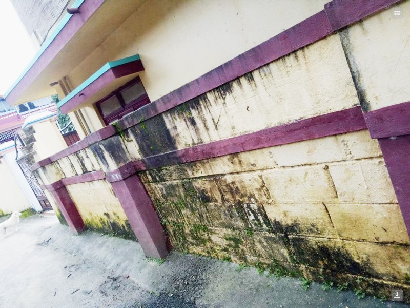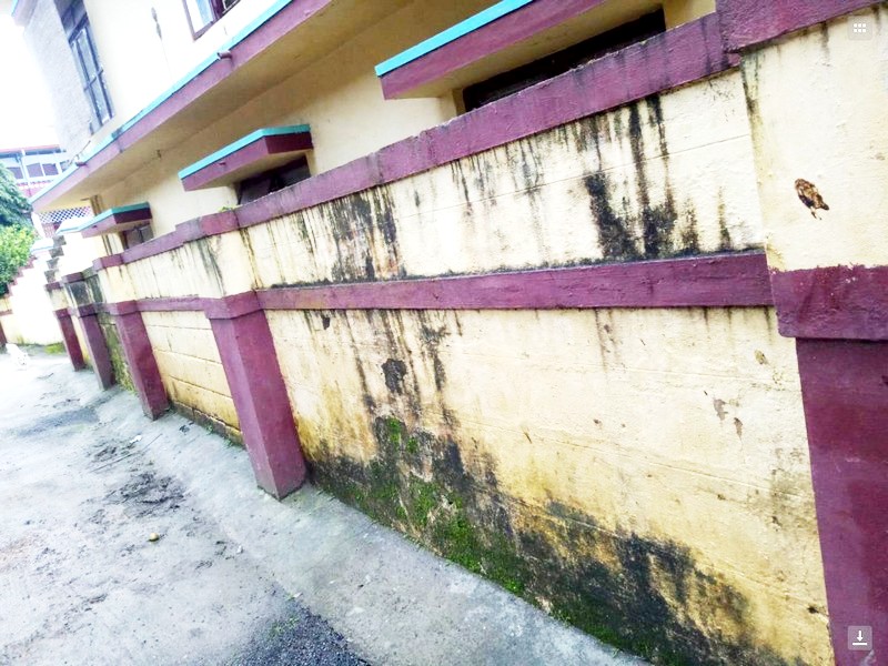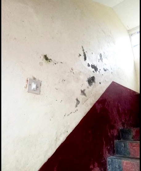 vách tường và nền gạch đã gần bị hư hại do nước mưa thấm xuống vì hệ