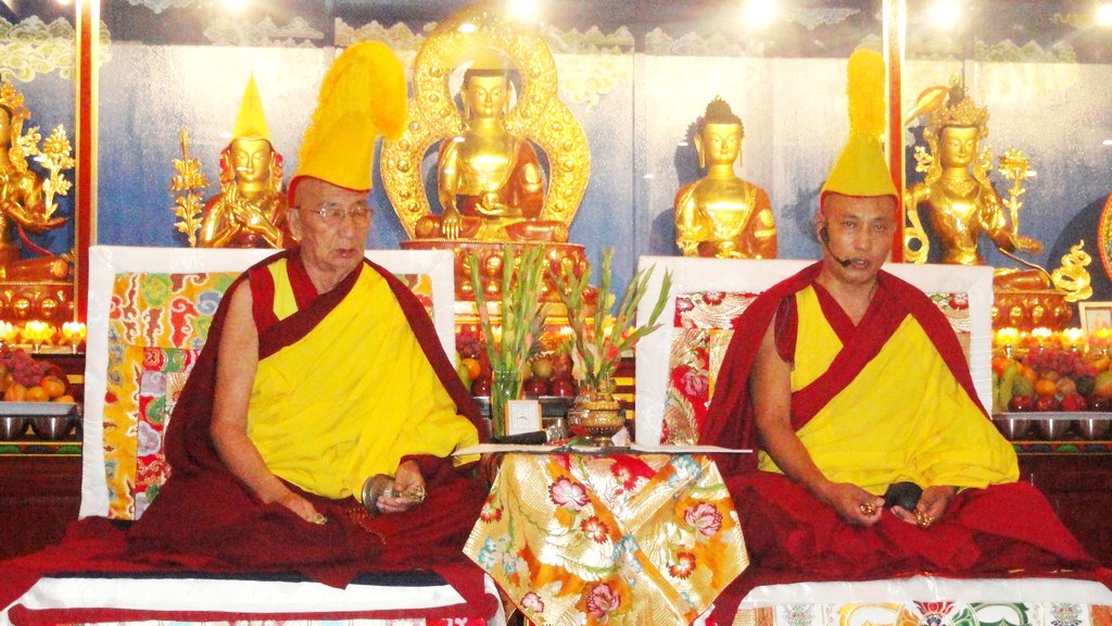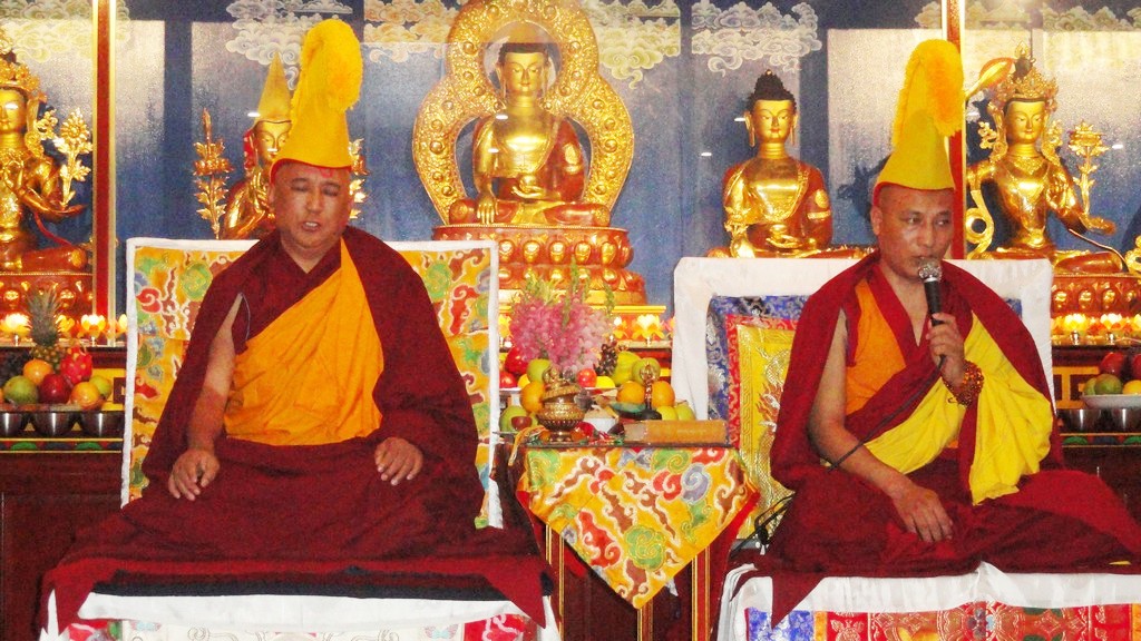 Vị Thủ Ngôi cao nhất của Truyền Thống Hoàng Mạo Phật Giáo Tây Tạng đến từ tu viện Sera ở Ấn Độ với hai vị thị gỉa